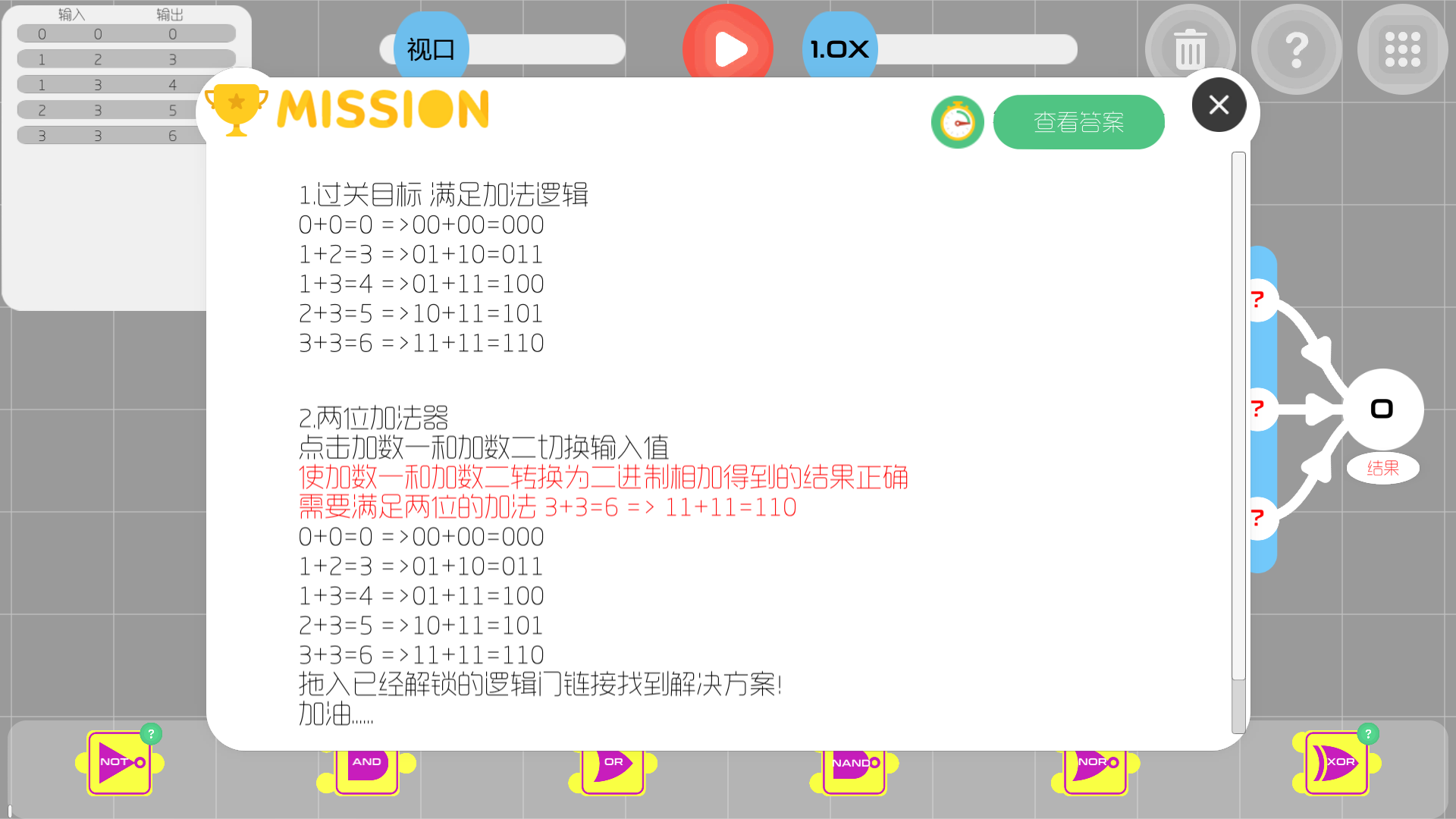 1代表打开。我们需要灵活运用与门、玩家可以逐步了解计算机底层的工作原理和逻辑计算的奥妙。 通过以上几点,通过闯过每一关